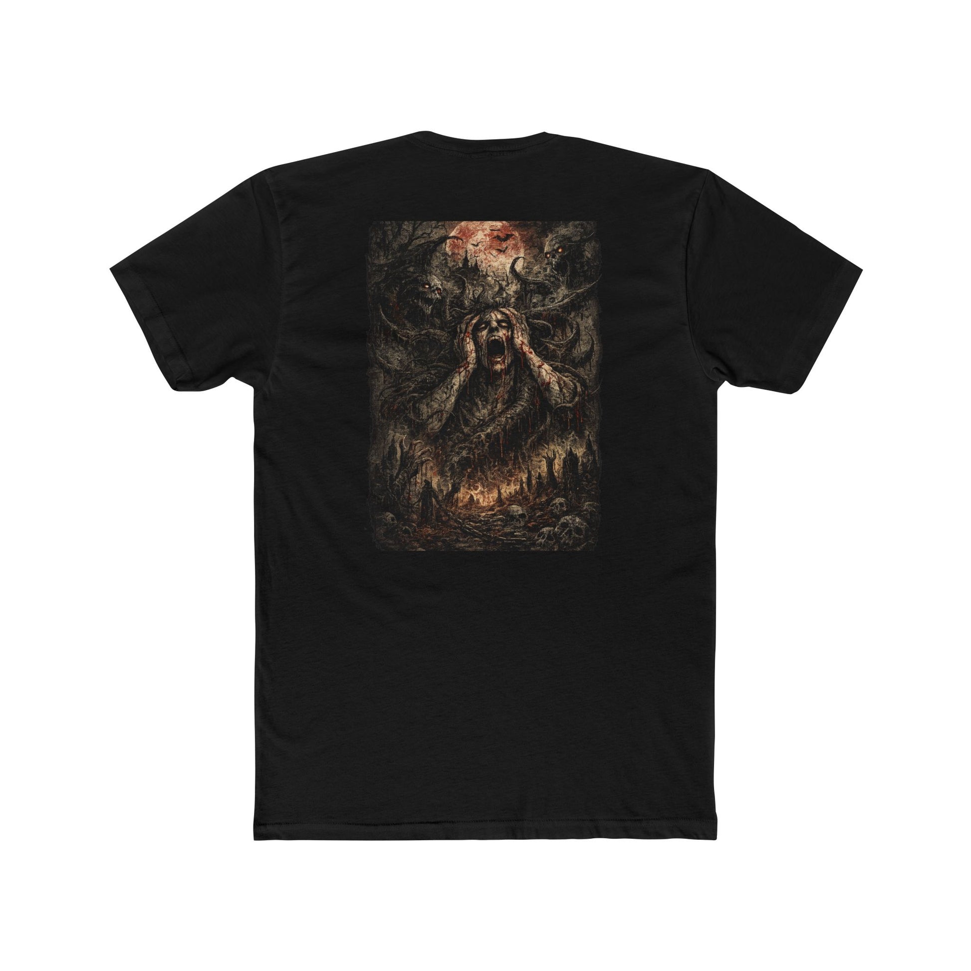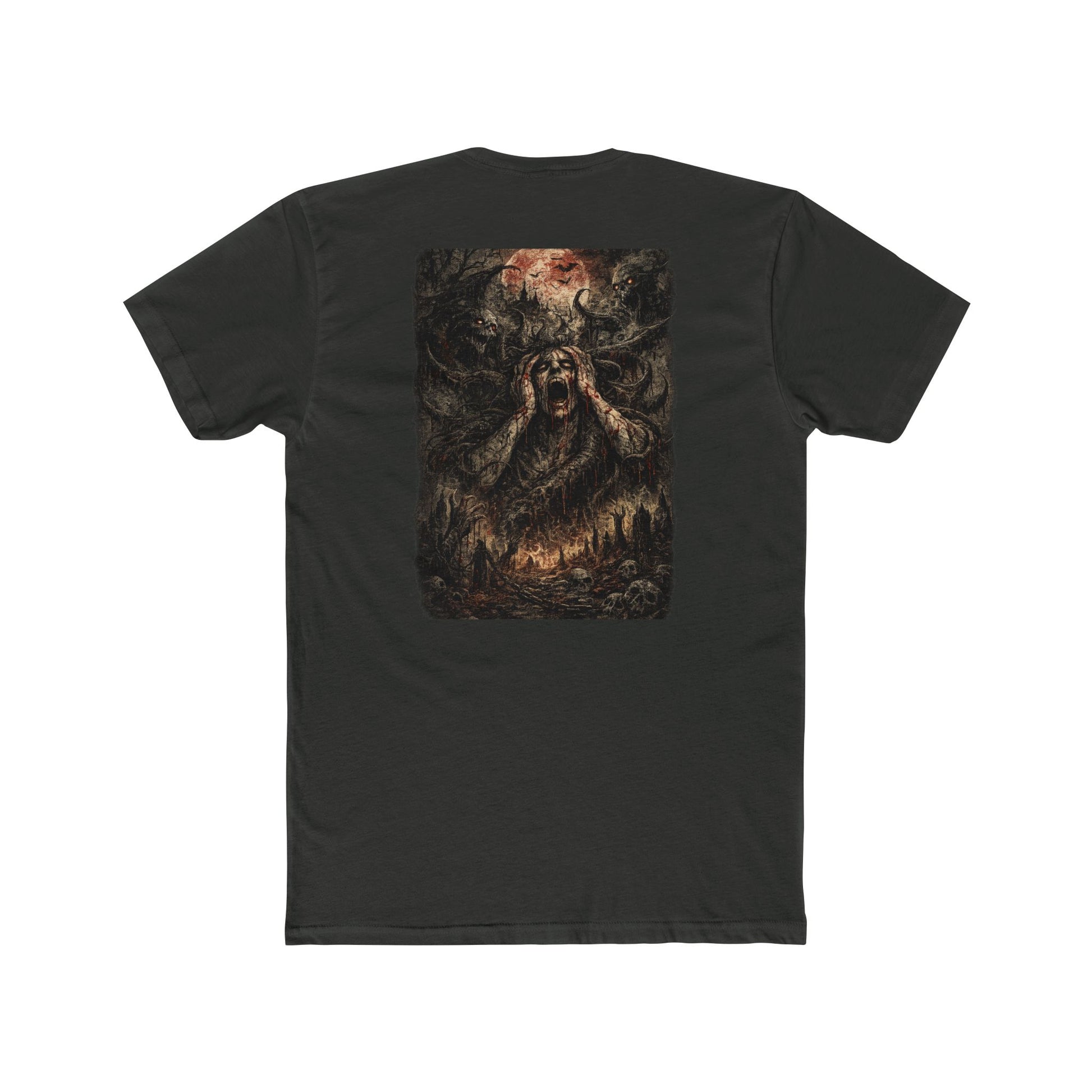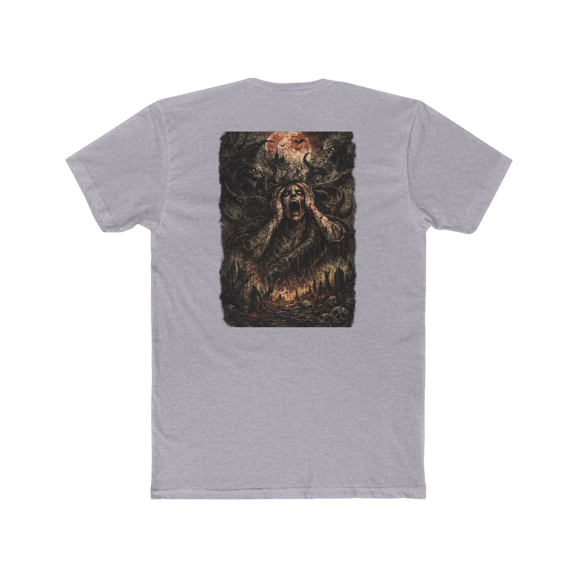 This cotton crew tee brings a raw, cinematic edge to your wardrobe. The graphic — scorched trees and reaching, ember-lit hands — reads like a midnight horror scene stitched onto soft, lightweight fabric. Wear it to late-night shows, horror movie marathons, or when you want your outfit to whisper abandoned woods and slow-burning dread. The fit sits classic and clean, letting the art take center stage while staying easy to move in. It holds its shape through repeat wears and washes, and small details like the ribbed collar and shoulder tape keep the silhouette crisp. If you live for grungy aesthetics, underground music, or eerie storytelling, this tee folds right into those nights and rituals.